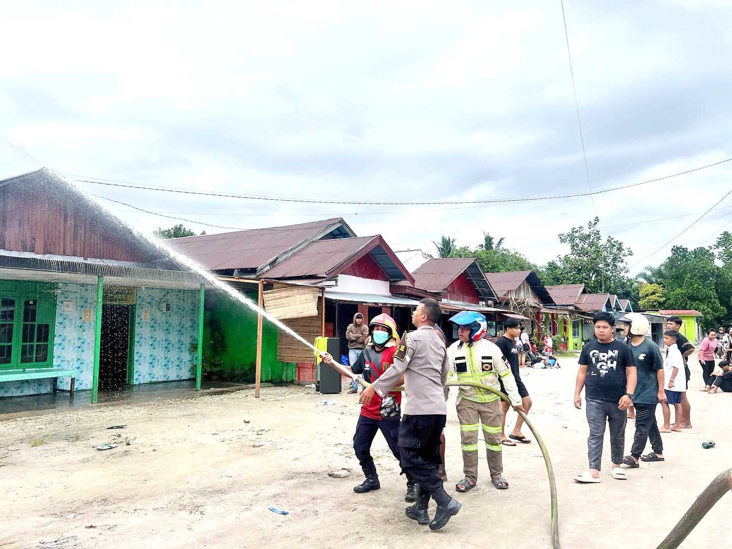 KEBAKARAN: Petugas berusaha memadamkan api yang menghanguskan rumah sekaligus warung minuman di Jalan Tjilik Riwut Km 19, Desa Hampalit, Kecamatan Katingan Hilir, Kabupaten Katingan, Senin (6/10/2025) pukul 14.30 WIB. FOTO WARGA UNTUK RADAR KALTENG