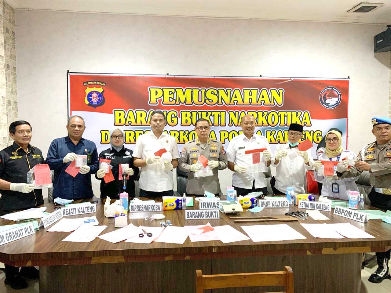 Pemusnahan barang bukti narkoba dilaksanakan di Kantor Ditresnarkoba Polda Kalteng Rabu (8/10/2025) siang, dipimpin Irwasda Polda Kalteng Kombes Pol Dr Benny Ganda Sudjana, didampingi Direktur Resnarkoba Kombes Pol Dodo Hendro Kusuma, serta dihadiri unsur kejaksaan, pengadilan, BNN, BBPOM, MUI, dan organisasi anti narkoba.