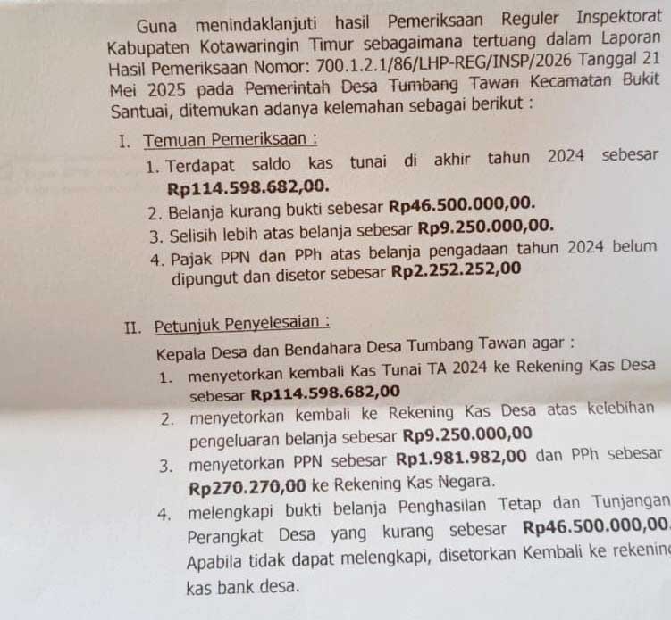 Sementara itu, Dinas Pemberdayaan Masyarakat dan Desa (DPMD) Kotim mengonfirmasi bahwa pihaknya telah mengeluarkan Surat Peringatan (SP) kedua kepada Kepala Desa Tumbang Tawan karena belum menindaklanjuti hasil pemeriksaan Inspektorat.