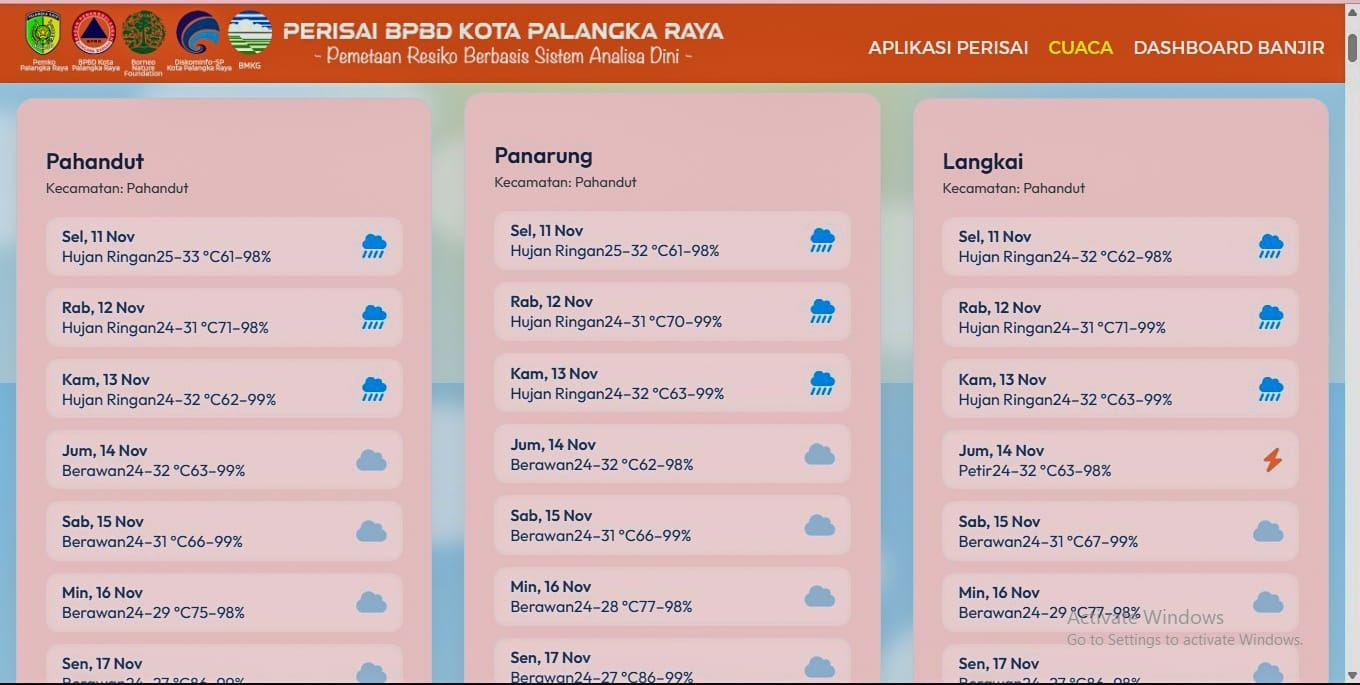 Selain itu, pihaknya juga sudah bekerja sama dengan Badan Meteorologi, Klimatologi, dan Geofisika (BMKG) untuk memberikan perkiraan cuaca per kecamatan yang bisa dilihat melalui aplikasi PERISAI. Yang mana, pada tanggal 14 hingga 15 November diprediksi akan mengalami hujan petir, seperti di Kecamatan Pahandut Kelurahan Langkai, Kecamatan Jekan Raya Kelurahan Menteng dan Palangka, Kecamatan Bukit Batu Tangkiling dan Sei Gohong.