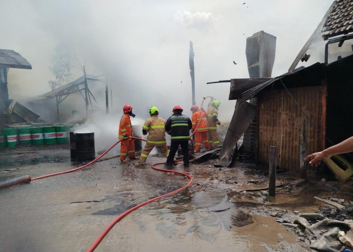 Oobjek yang terbakar meliputi satu gudang semi permanen, tiga rumah barak bagian atap, satu rumah permanen bagian atap, dua truk pengangkut minyak jenis solar industri dan satu sepeda motor.