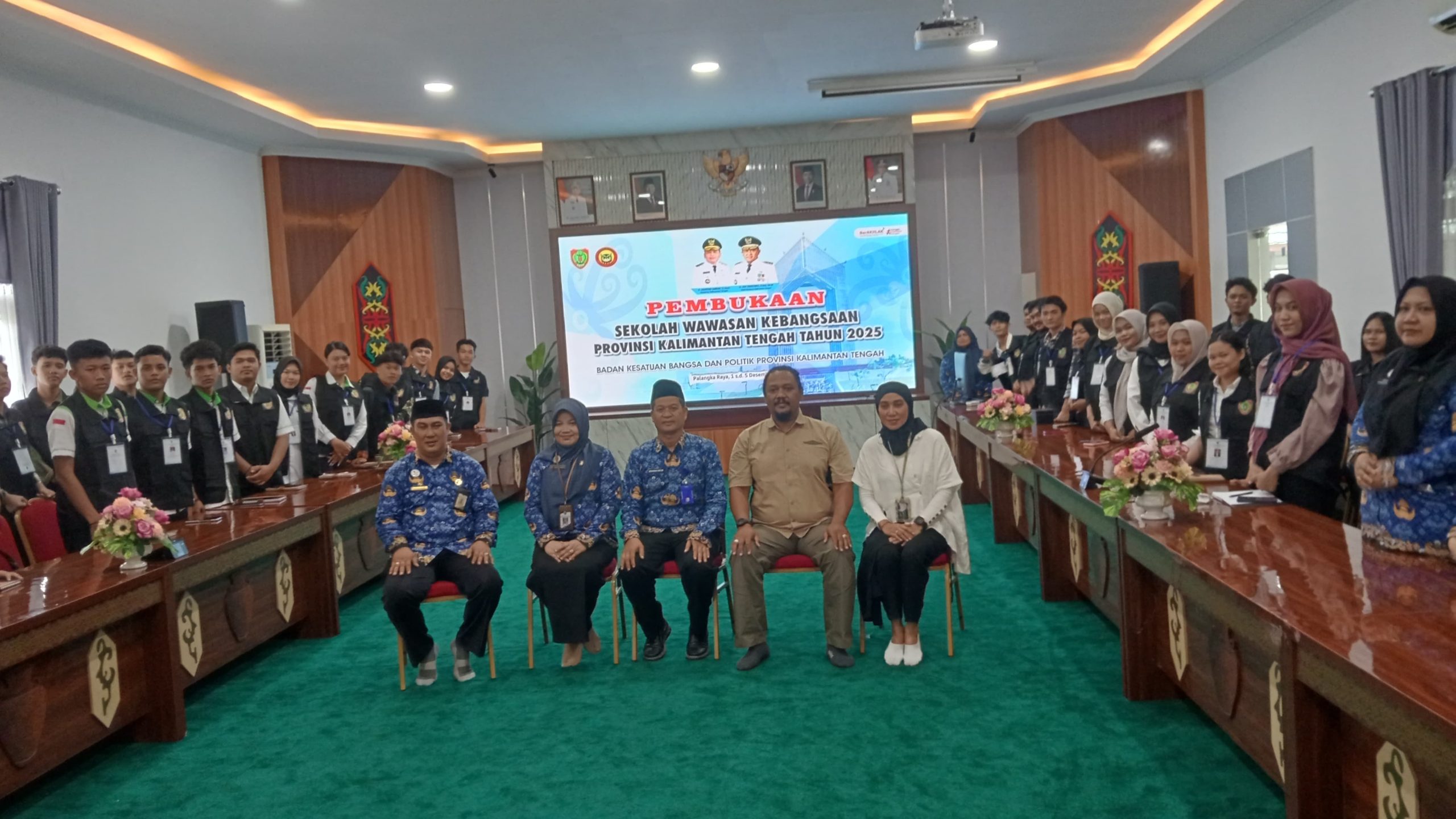 PEMBUKAAN: Plt Kesbangpol Provinsi Kalteng, Muhammad Rus'an (tengah) foto bersama usai Pembukaan Sekolah Wawasan Kebangsaan Tahun 2025 di Aula Rahan Pumpung Hapakat Kantor Kesbangpol Kalteng, Senin (1/12/25).Foto: IFA/Raka
